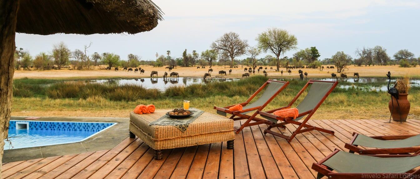 The main lodge is an open fronted dining, sitting and bar with a teak viewing deck. There is a swimming pool as well and below is a wonderful campfire area overlooking the plains.