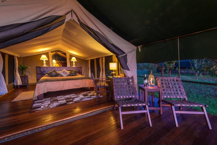 Breakfast and lunch at Little Governors' Camp are served al fresco, perhaps with the odd elephant strolling past. In the evening a warming log fire burns in front of the bar tent, and a festive dinner is served by candlelight in the nearby dining tent. In keeping with authentic safari tradition, lighting is by gas and kerosene lanterns, or by candlelight but power is available at reception for recharging batteries.