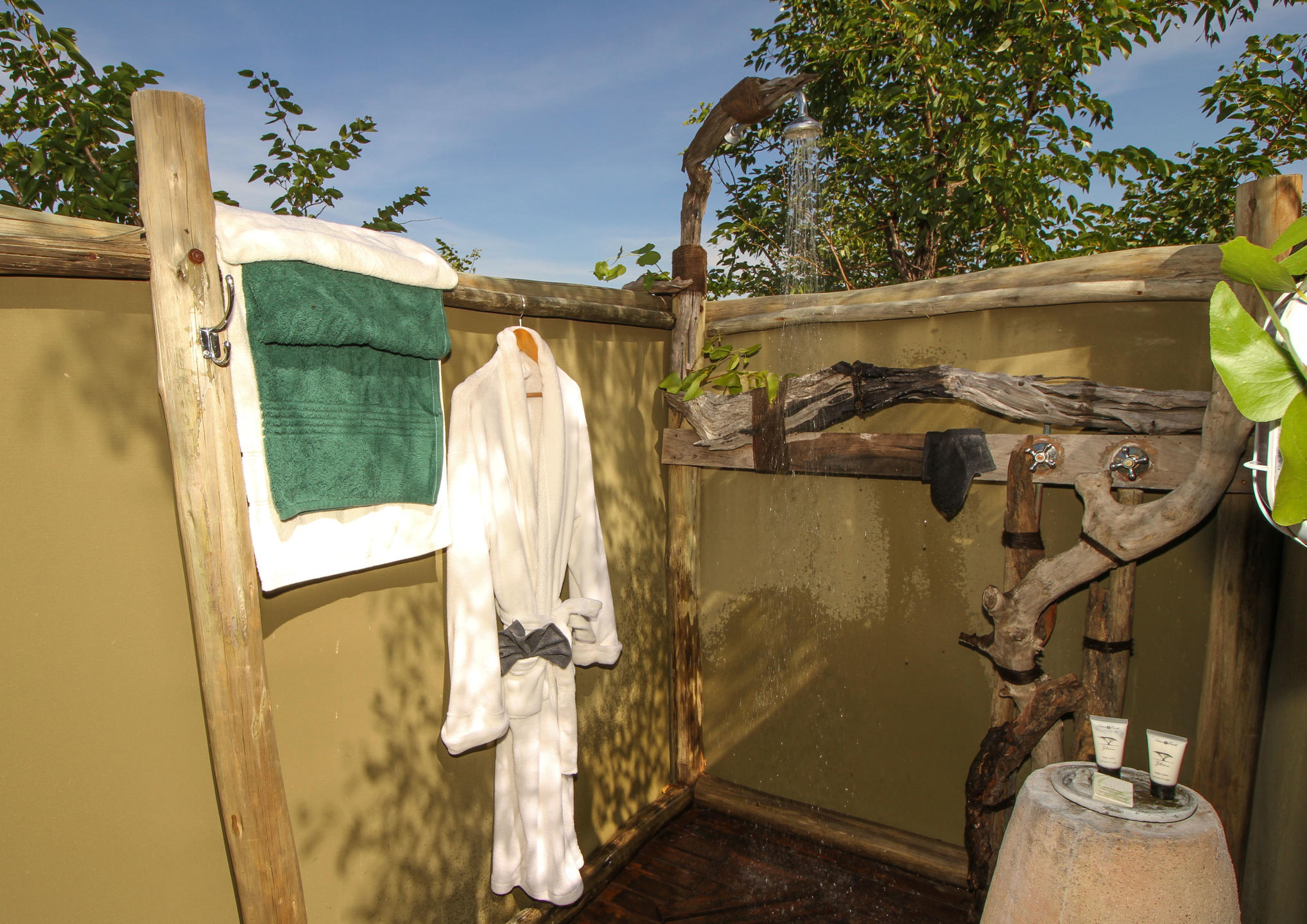There is one Double Room with a daybed: 60 sq m under thatch on a raised deck overlooking the waterhole with one kingsize bed and a daybed, ensuite bathroom with free-standing bath, outdoor shower. The other three double Rooms are the same size but without the daybed.