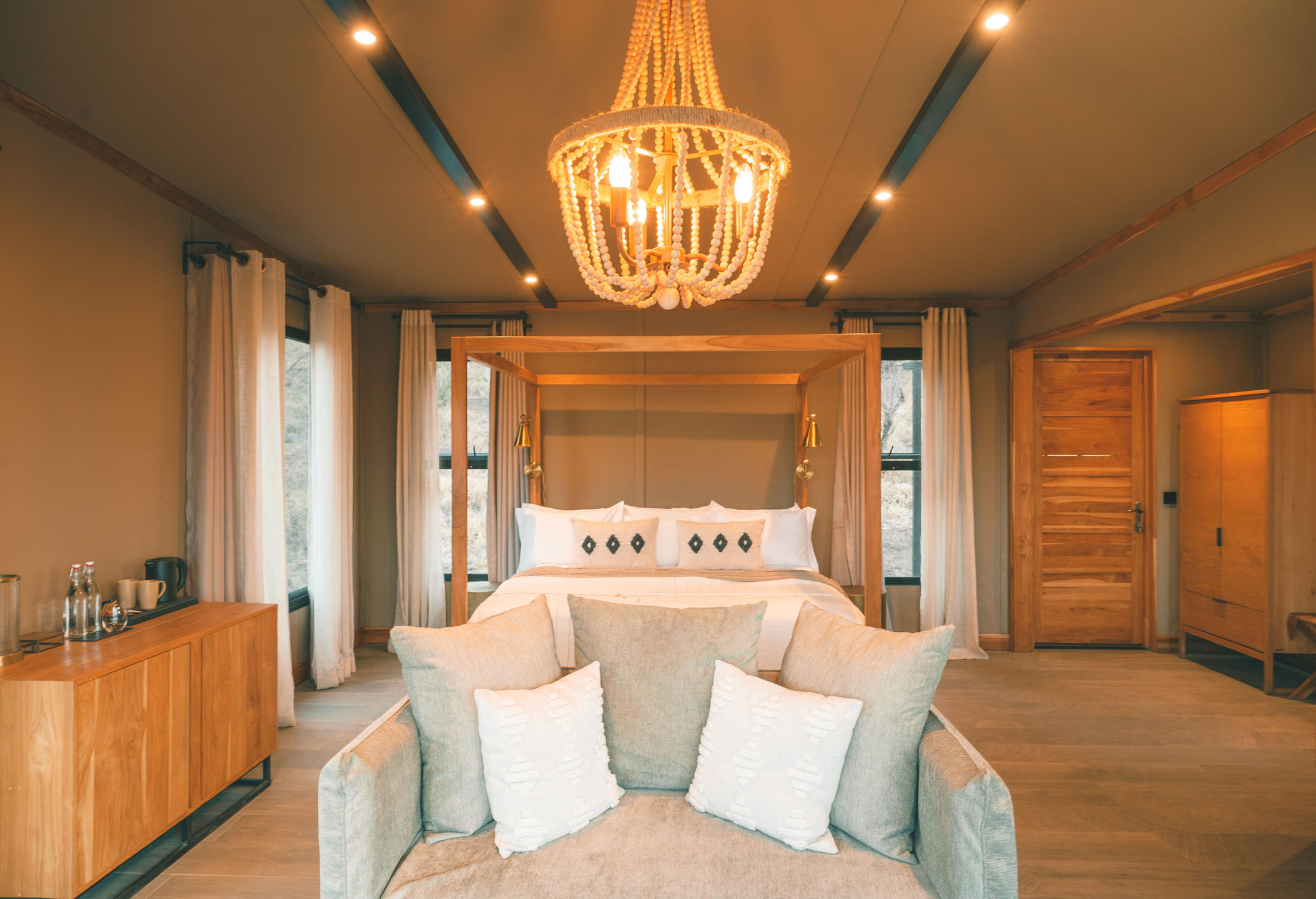 Each tent evokes a richness and beauty and has been cleverly styled to combine modern furnishings with the feeling of adventure from a bygone era whilst ensuring minimal impact on the environment. Each tent is tastefully furnished and has all the essential amenities of a luxury camping experience. The tented suites have rain showers, vanity with double basins, writing desk with ample charging points, fixed wooden doors & Persian carpets.
