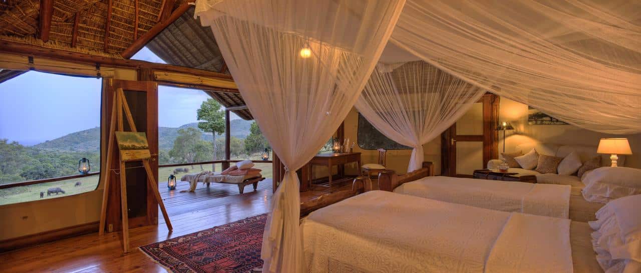 The Family Villa has two en suite bedrooms and a large lounge with dining area, comfy sofas around a fireplace, antique prints and reference books. Outside the large veranda makes the most of the magnificent Masai Mara scenery.