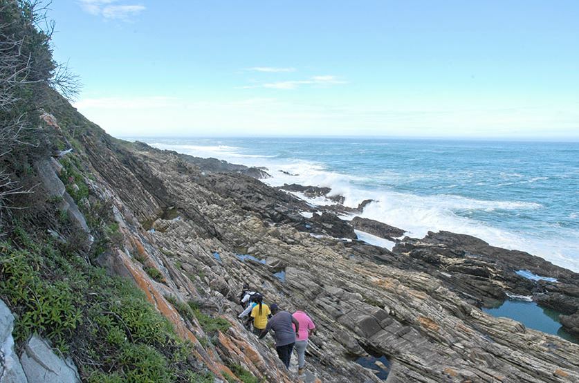 Hikers follow a steep path from their chalets straight down to the rock pools. Today’s route is mainly at sea level and the morning walk along the coast is magnificent. Enjoy the beautiful plant life and rocky scenery, and keep your eyes open for the spoor of the Cape Clawless Otter in “Otter’s Alley”.