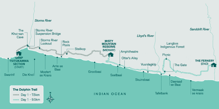 The Dolphin Trail is a luxury and fully portered hiking or slackpacking trail along the Tsitsikamma coastline. A beautiful part of the Garden Route. This unique trail allows you to sample some of the coastal scenery seen on the Otter Trail without the hardship of having to carry your own gear and sleep in basic huts!