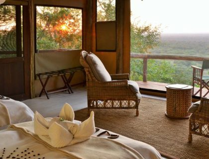 The lodge is built on a beautiful hill with lots of Baobab trees and amazing views of the Savanna bush below. The tents are all facing east on the hillside so we could see the sunrise. They all overlook a waterhole where animals come to drink regularly. All the rooms are made of canvas and have a private wooden deck. Once inside, you wouldn’t even say it was a tent. It has the complete feel of  comfort.